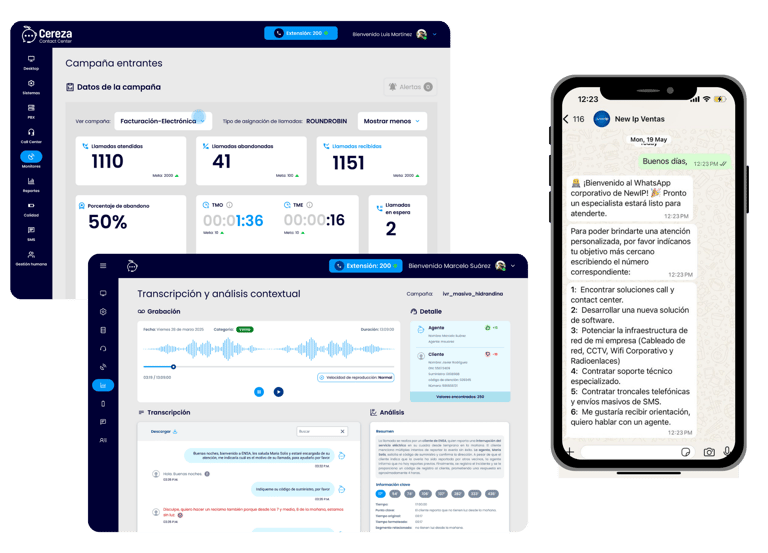 Transforma tus canales de atención en una sola plataforma: centraliza llamadas, WhatsApp y redes sociales, automatiza procesos y mejora la experiencia de tus clientes.